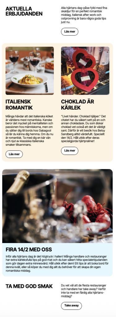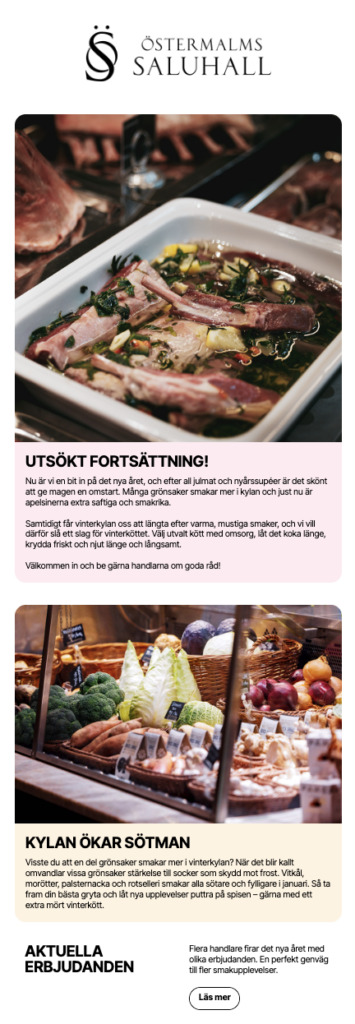 Kommunikasjonen er i dag basert på inspirasjon, forhandlernes tilbud, sesonginnhold og opplevelser og tilbud knyttet til Saluhallen. En tydelig verdi i hver eneste utsendelse.